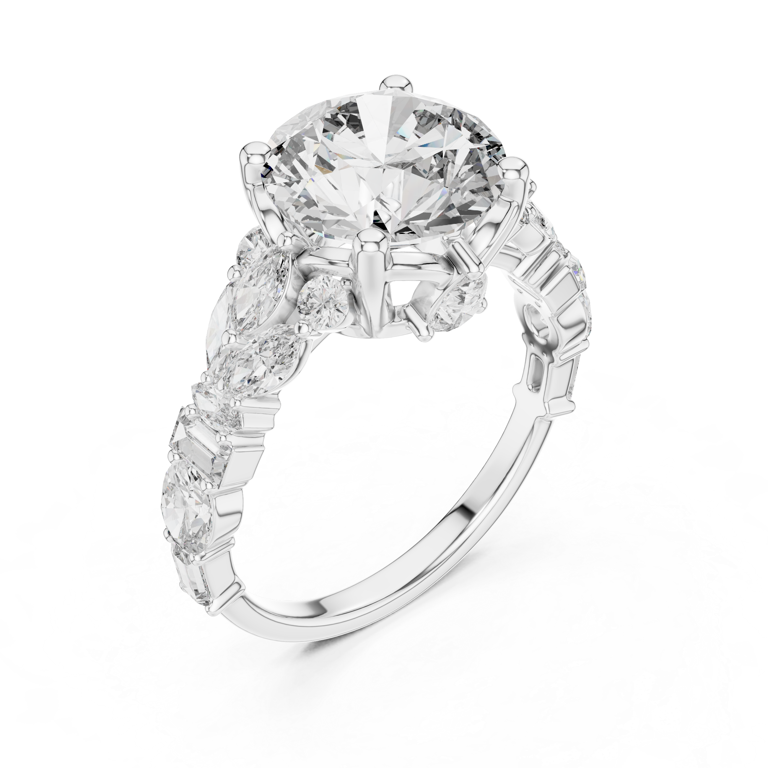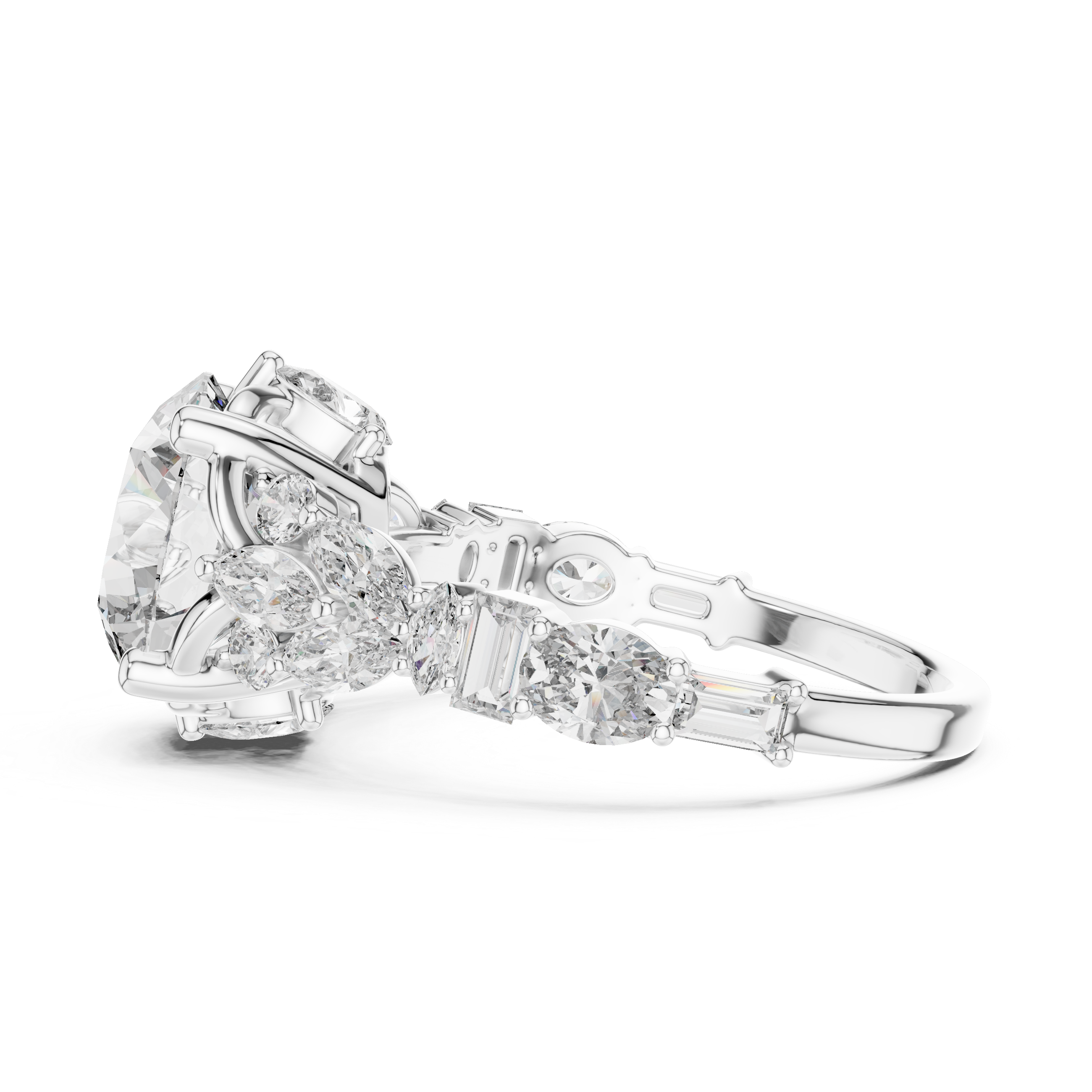 - Side Stone Shape: Marquise, Baguette, Round, Oval, Pear